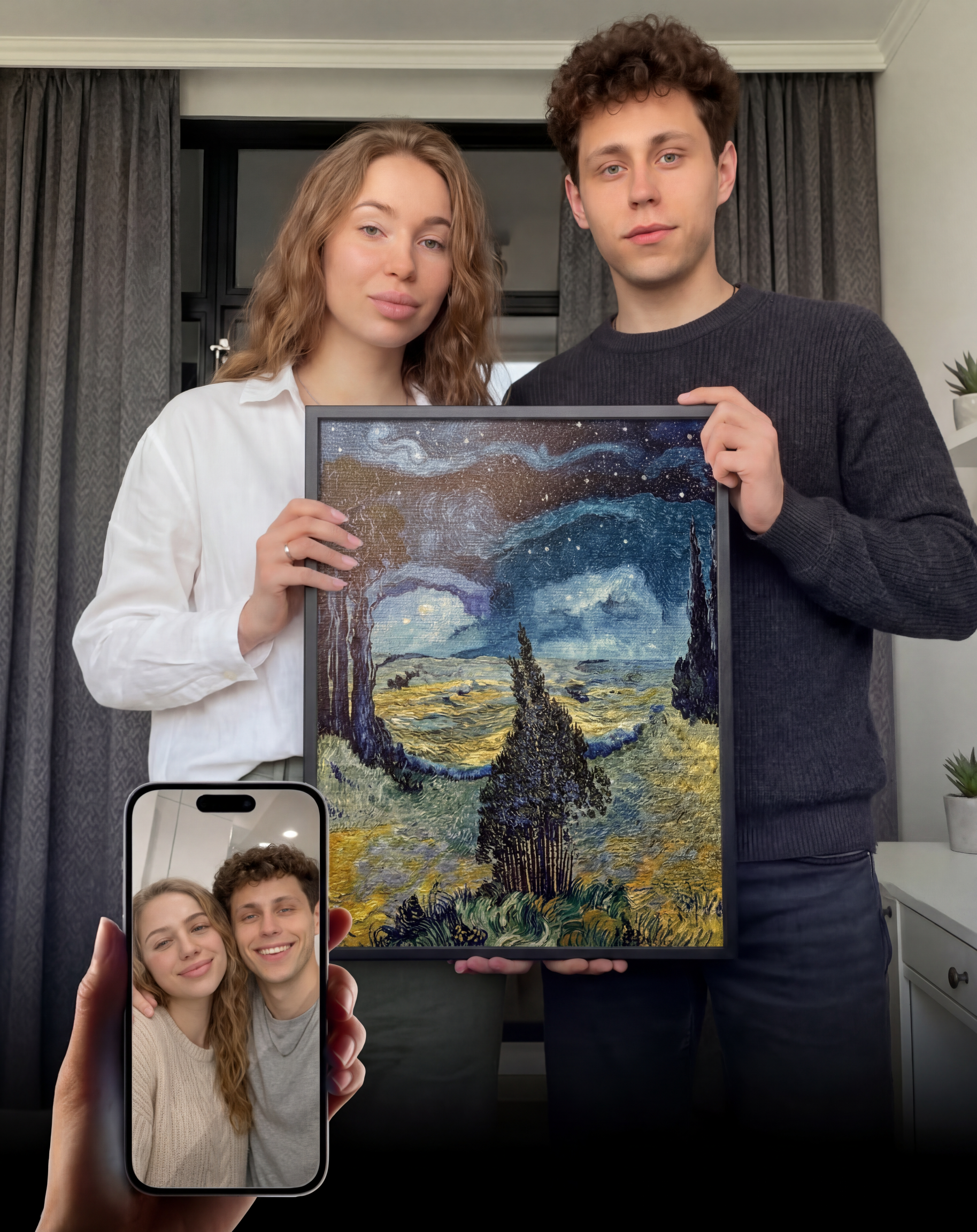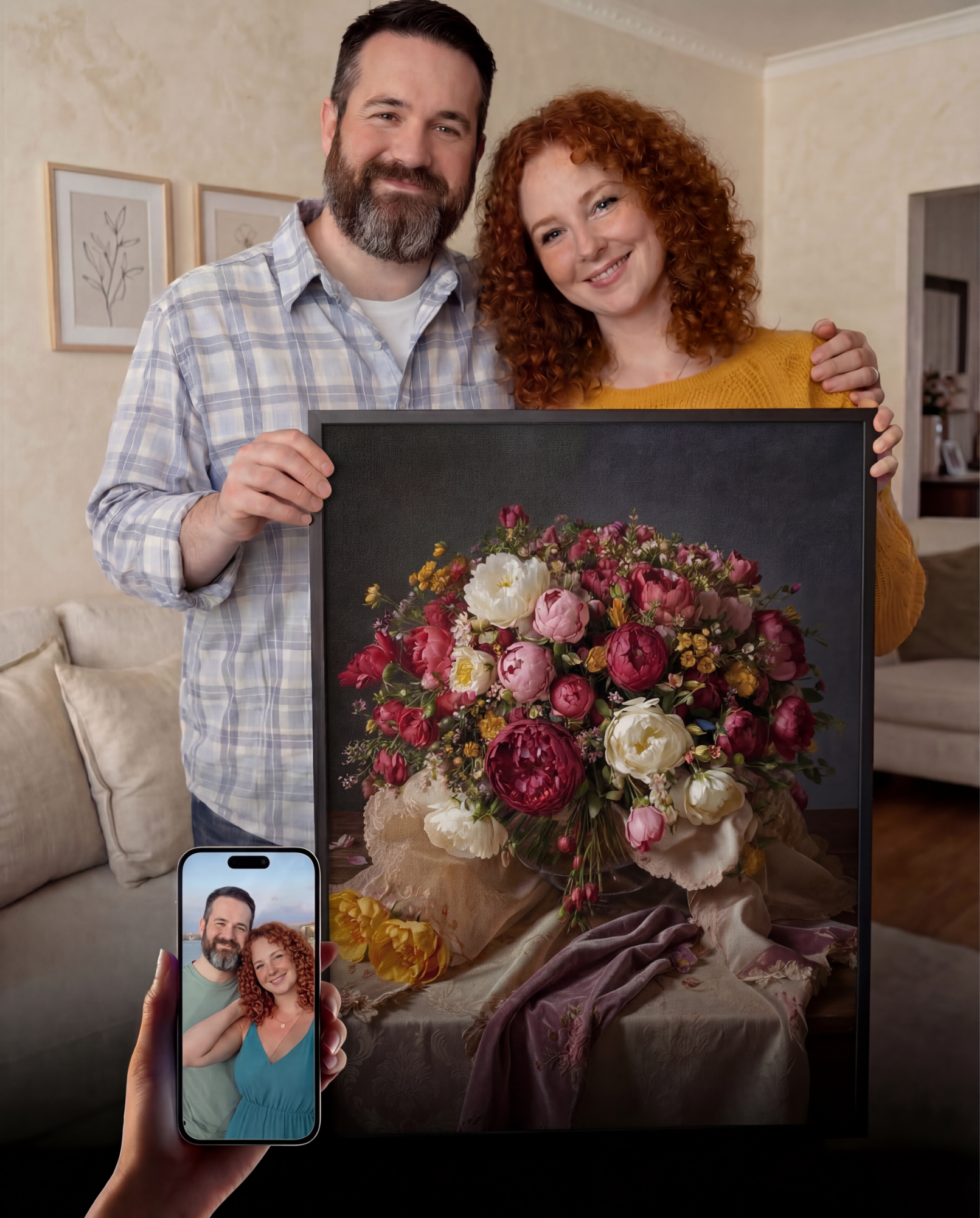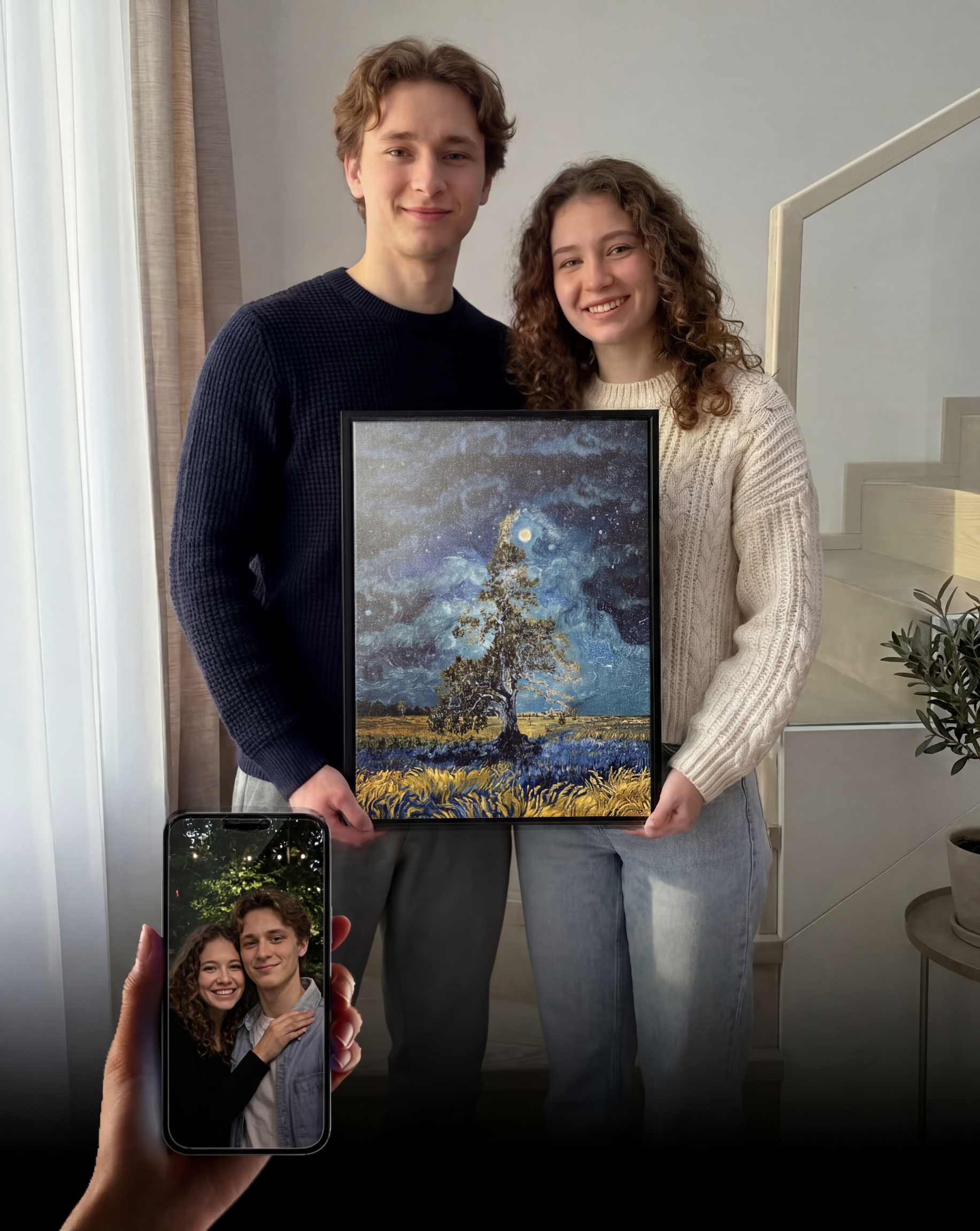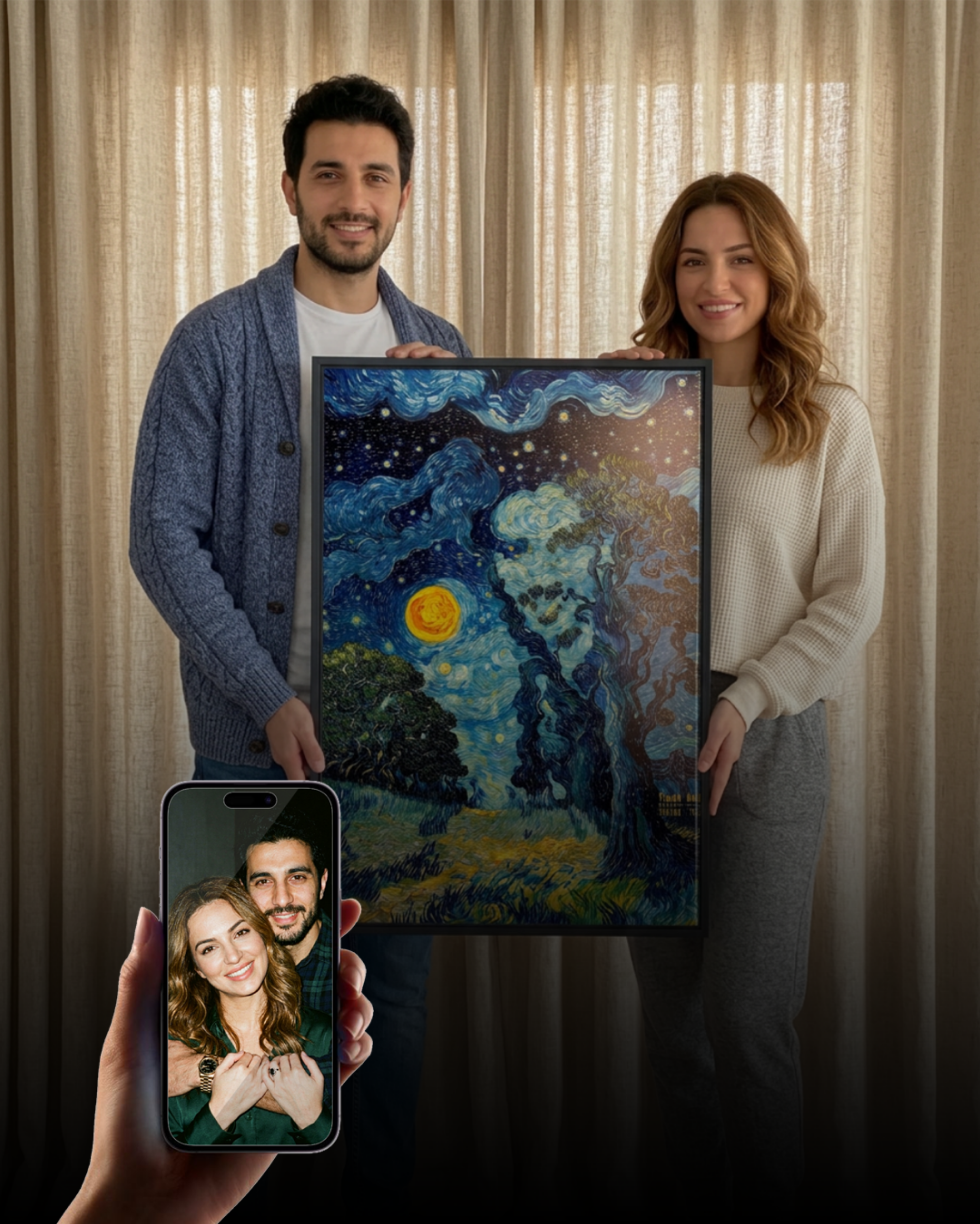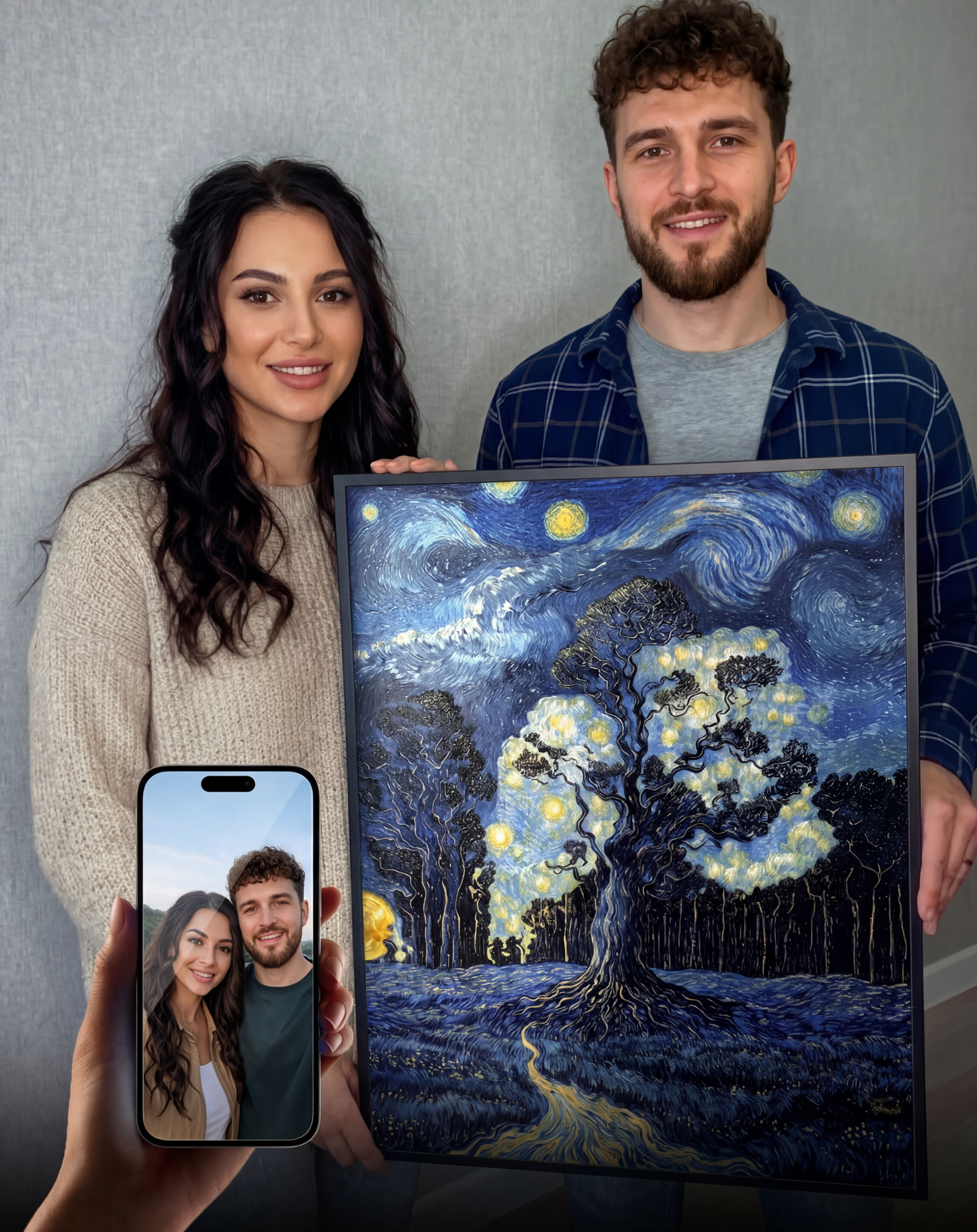 Turn your favorite photo into a timeless piece of fine art. Whether it's a couple, family, or a meaningful moment, we transform your image into a beautifully crafted artwork that subtly reveals your portrait.